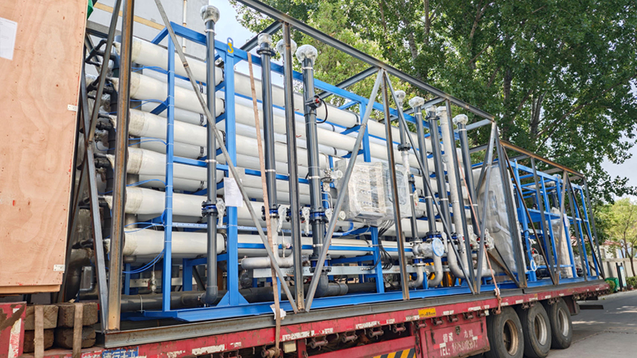 此次發貨的設備包括多介質過濾器、反滲透主機、EDI主機、加藥裝置、風機、電控柜等工程配件。因海運運輸,設備全部用木箱進行打包,現場看到工程人員安全有序的操作著行車進行裝車,裝車后大車緩緩的駛出廠區發往港口。