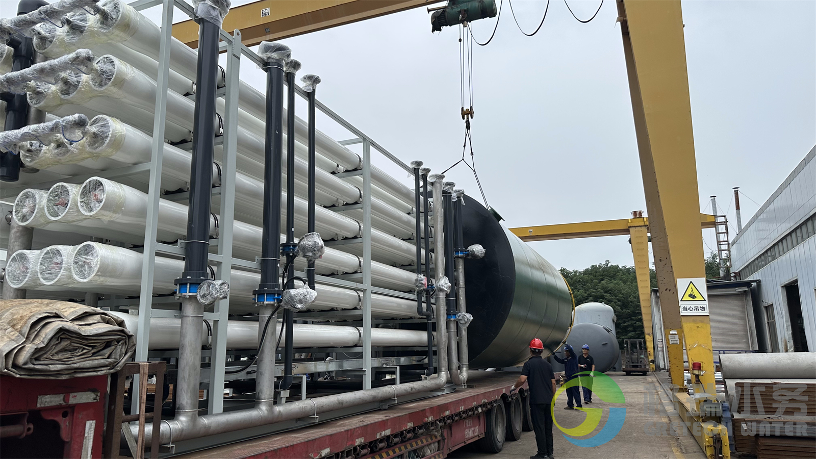 此項(xiàng)目為2x100t/h濃水處理系統(tǒng)設(shè)備,發(fā)貨的設(shè)備有反滲透機(jī)組、精密過(guò)濾器、保安過(guò)濾器、濃水水箱、提升泵等項(xiàng)目配套設(shè)備。現(xiàn)場(chǎng)工作人員安全有序的操作著行車裝車,裝車后大車緩緩的駛出廠區(qū)發(fā)往客戶的項(xiàng)目工程地。